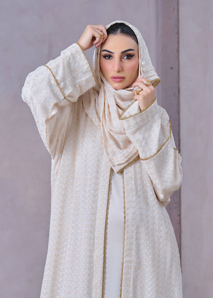 Zari in beige is a 3-piece open front abaya set, crafted from chiffon brochia. This elegant set includes a slip and hijab, offering a complete look