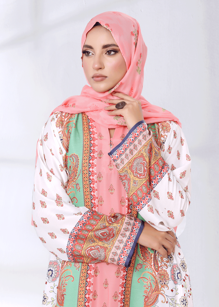Accompanying this abaya is a matching hijab, crafted from a blend of solid and brosche fabrics to complete the ensemble. The harmonious mix of textures creates a cohesive outfit that’s perfect for those seeking polished yet contemporary attire.
