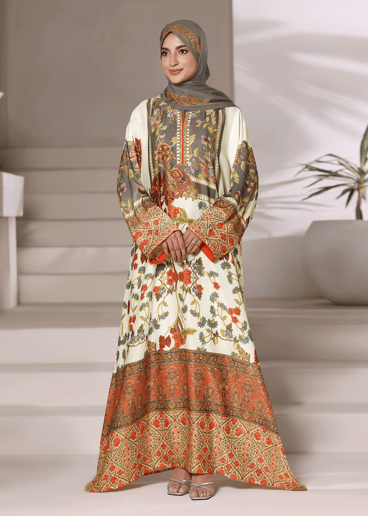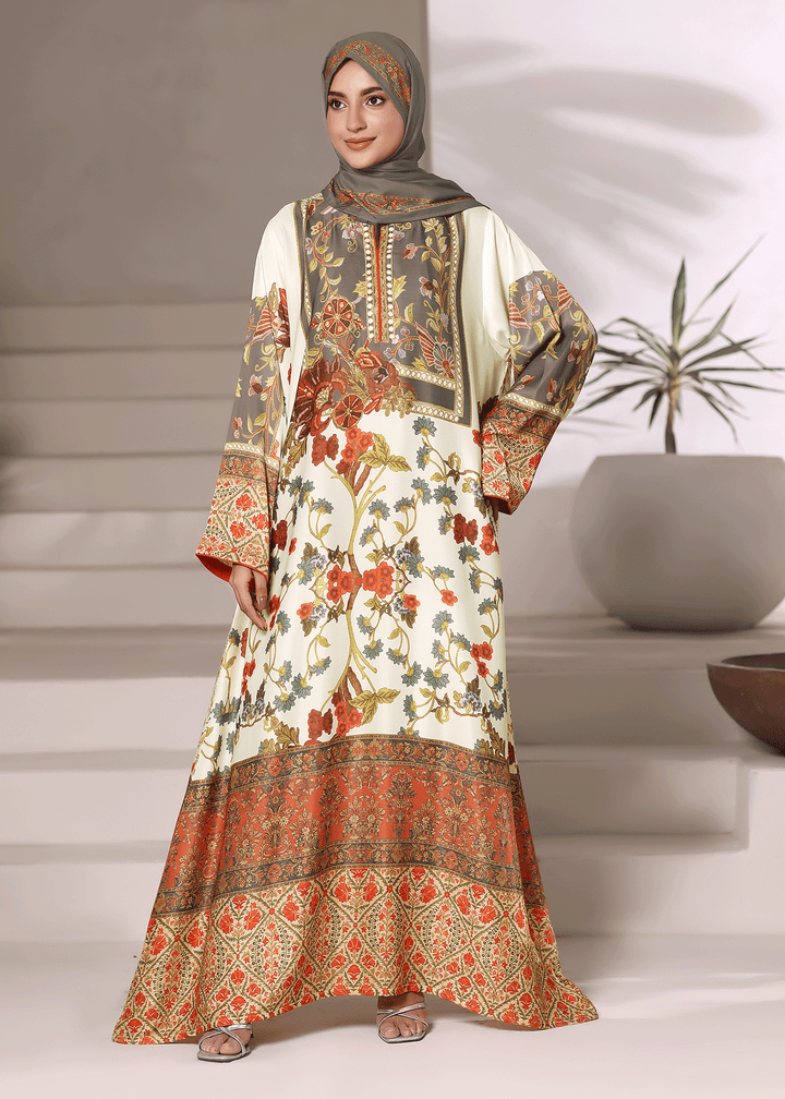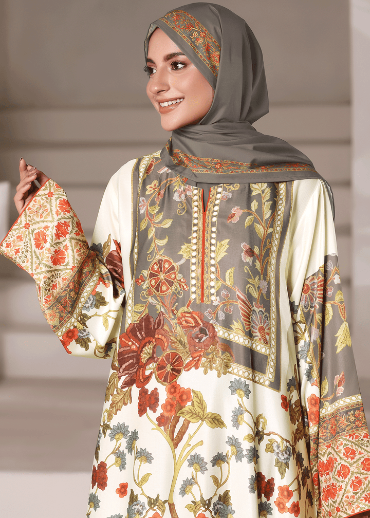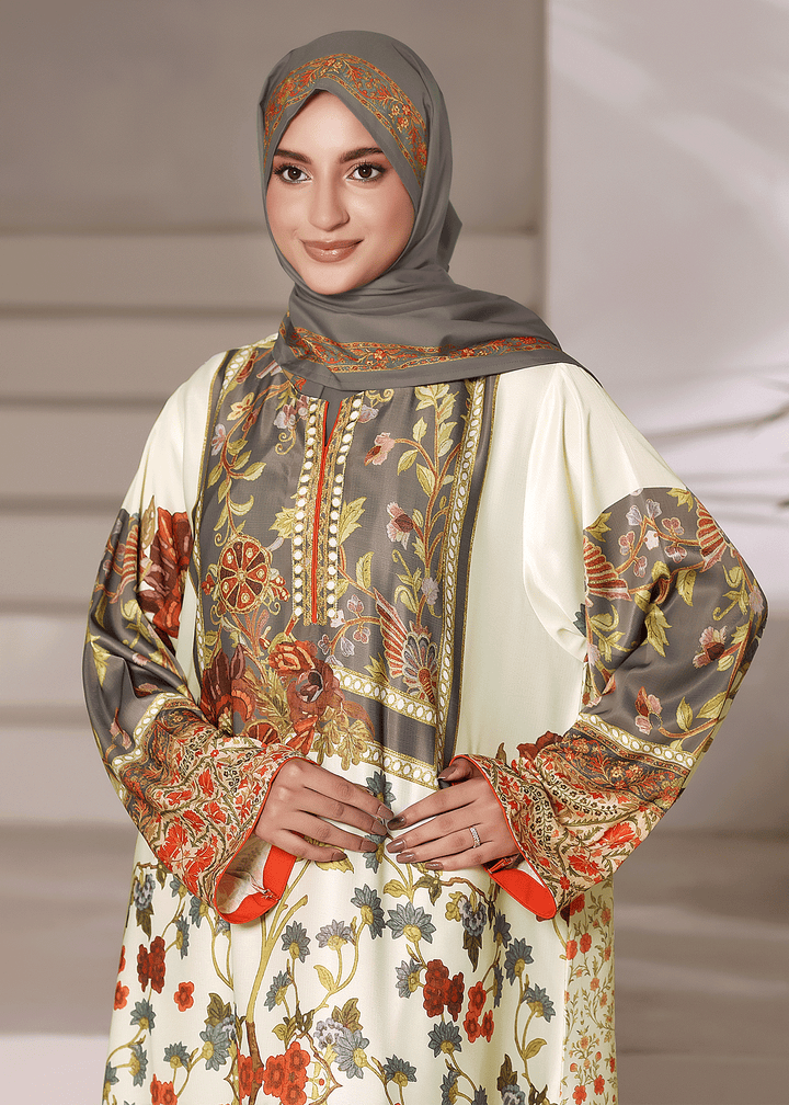 Accompanying this abaya is a matching hijab, crafted from a blend of solid and brosche fabrics to complete the ensemble. The harmonious mix of textures creates a cohesive outfit that’s perfect for those seeking polished yet contemporary attire.