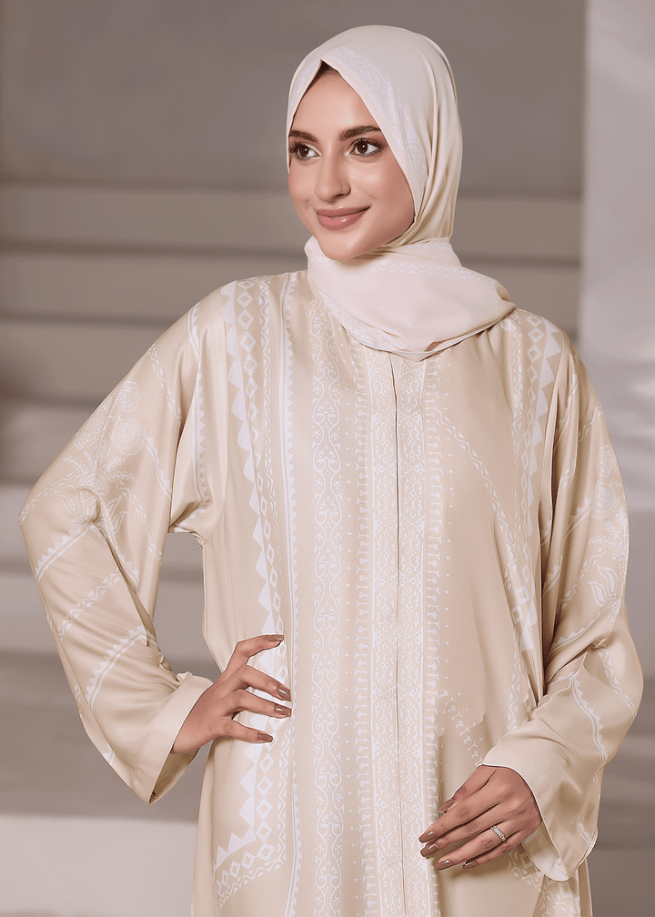 Accompanying this abaya is a matching hijab, crafted from a blend of solid and brosche fabrics to complete the ensemble. The harmonious mix of textures creates a cohesive outfit that’s perfect for those seeking polished yet contemporary attire.