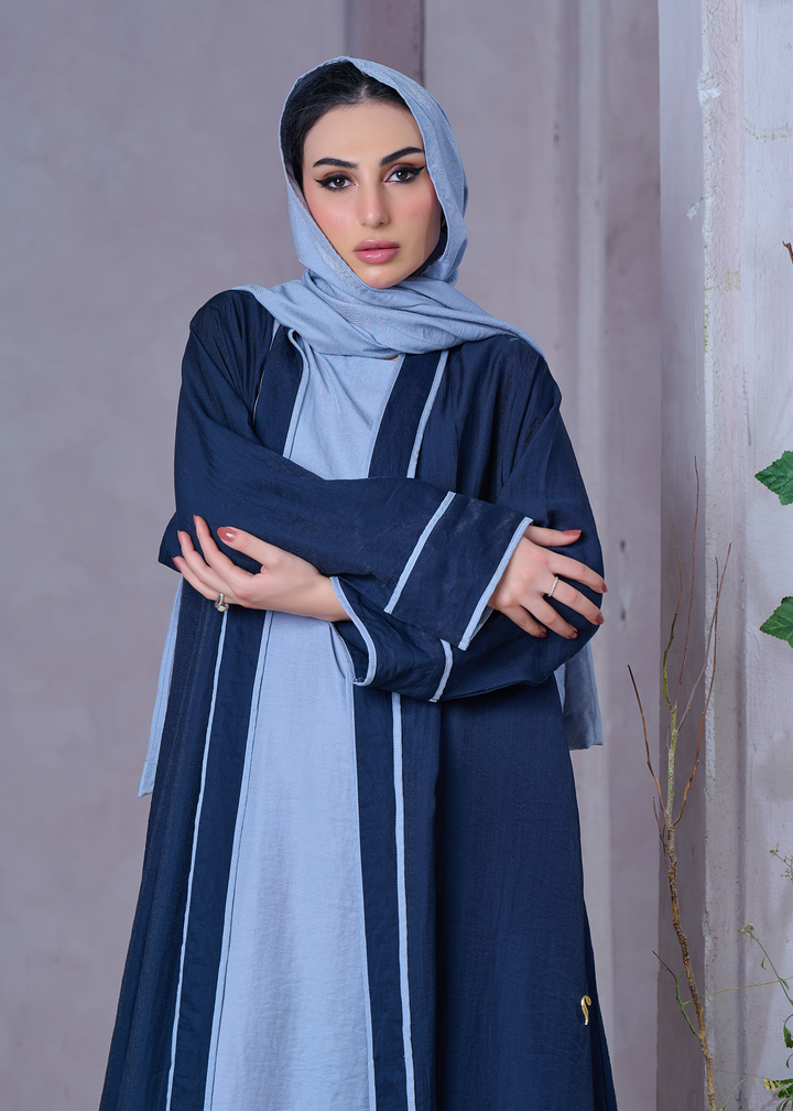The Sable Trim in navy offers a refined open abaya set with piping details, expertly crafted from textured premium crepe for a polished, contemporary look.